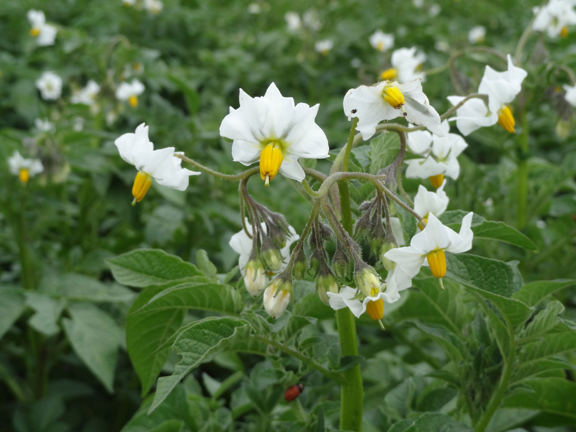 Bij de hunebedden gaat het Drenthepad linksaf verder via de Hogeweg. Op dit punt gaan we volgende keer verder, maar nu gingen we rechtdoor langs een bloeiend aardappelveld.