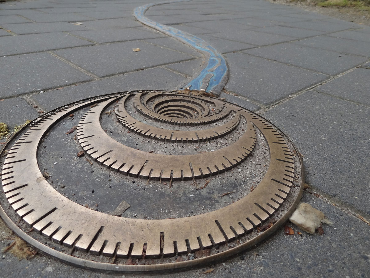 Daarna liepen we richting het centrum van Zwolle. Op de stoep van de Stationsweg zagen we een blauwe lijn, onderdeel van de kunstroute die er sinds begin dit jaar ligt. De lijn kwam uit in een grote bronzen plaquette, een kaart van de stad Zwolle van prehistorie tot in de toekomst, met in 5 talen de zin "De toekomst heeft een lang verleden". Mooi hoor!