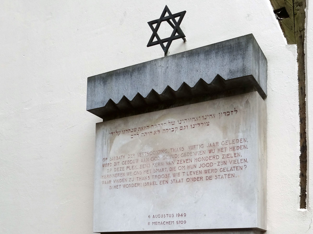 We staken het water over en liepen langs de Sassenpoort de binnenstad in, even later sloegen we rechtsaf de Schoutenstraat in, waar we langs de synagoge kwamen, met aan de muur een tekst ter nagedachtenis aan de joden die in de oorlog zijn omgekomen, die werd aangebracht bij het 50-jarig bestaan van de synagoge.